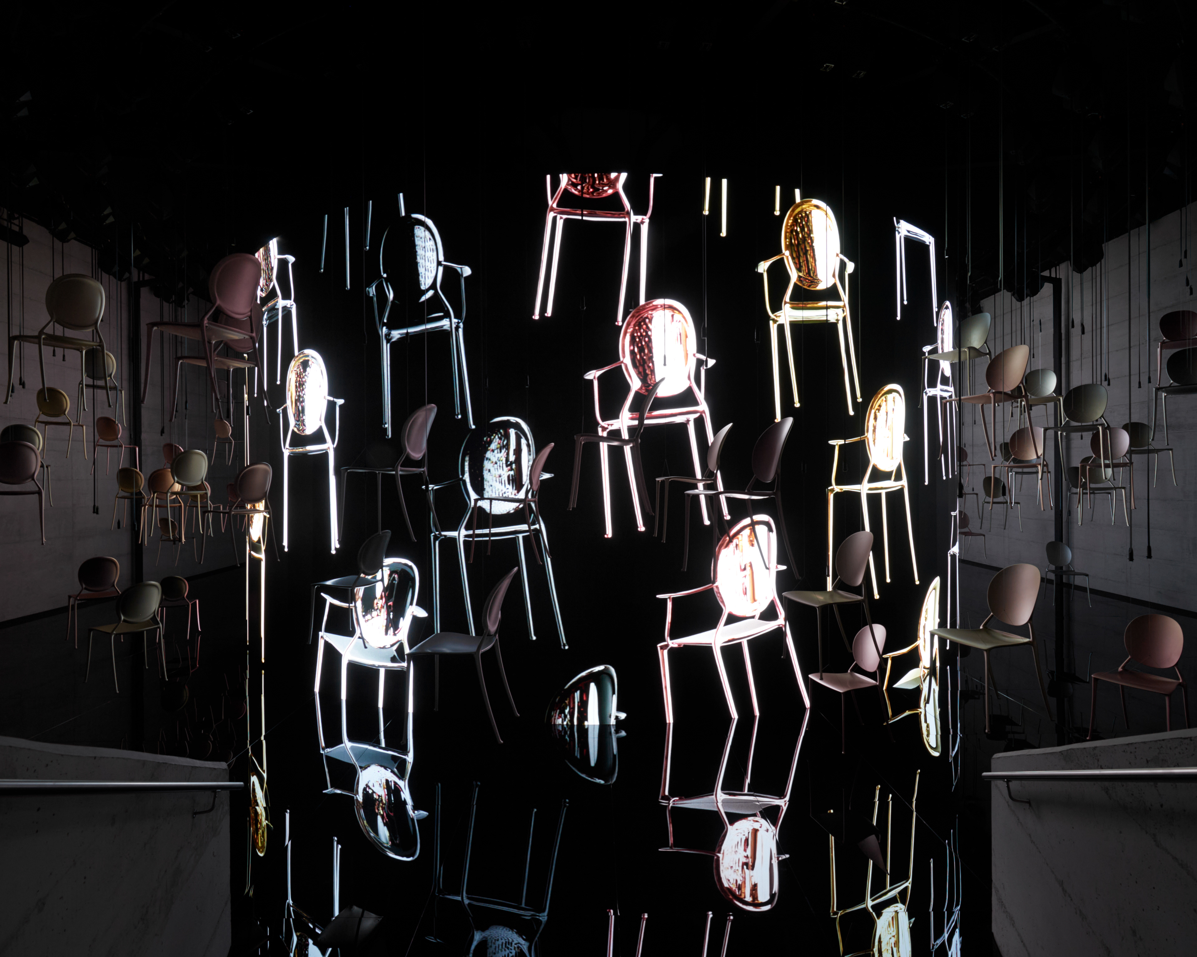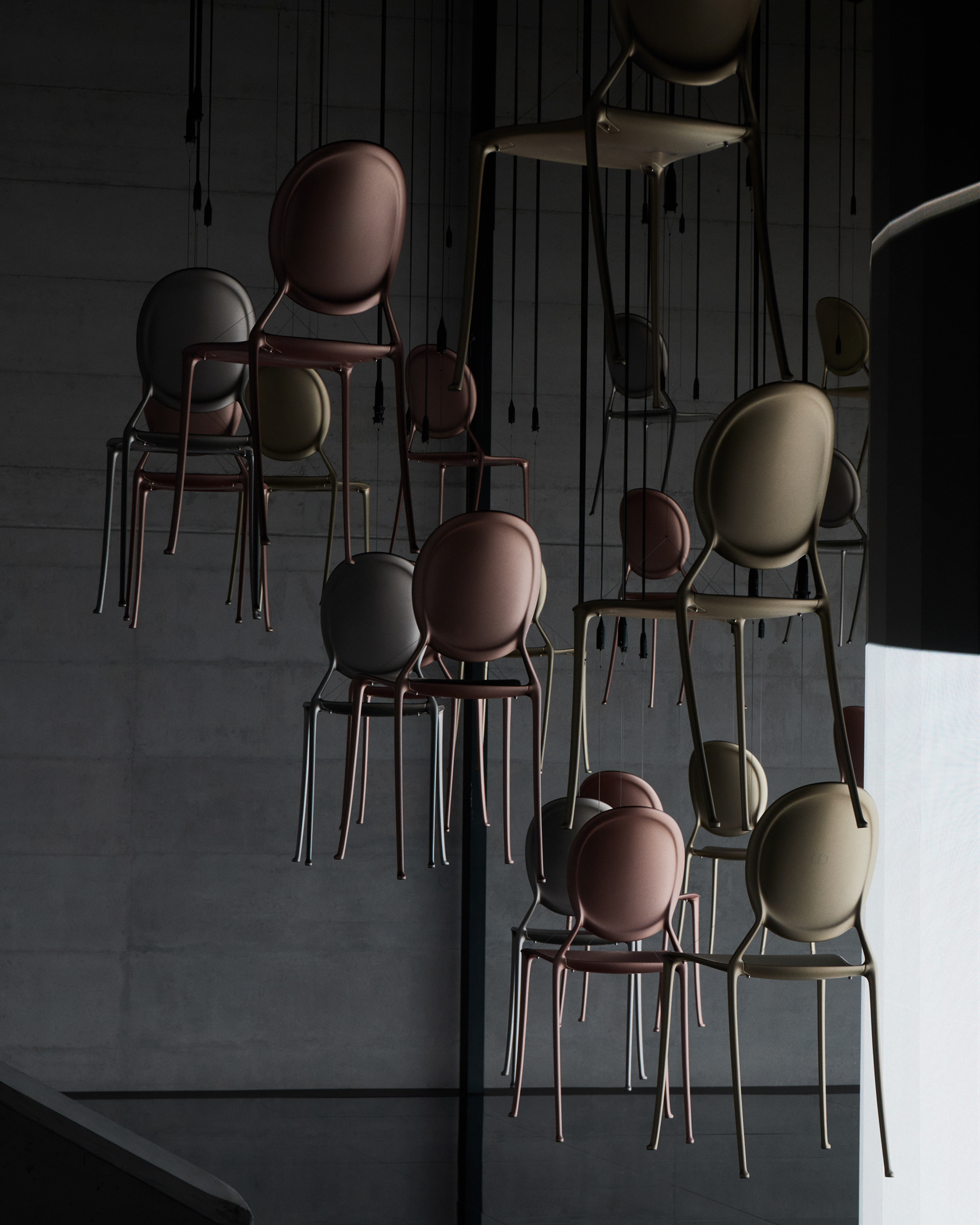 We conducted extensive research and development in-house to find the best way to convey the materiality of the chair and its craftsmanship. Philippe Starck is known for his humor, so we incorporated exaggerated chair assemblies and playful movements to reflect his unique style.