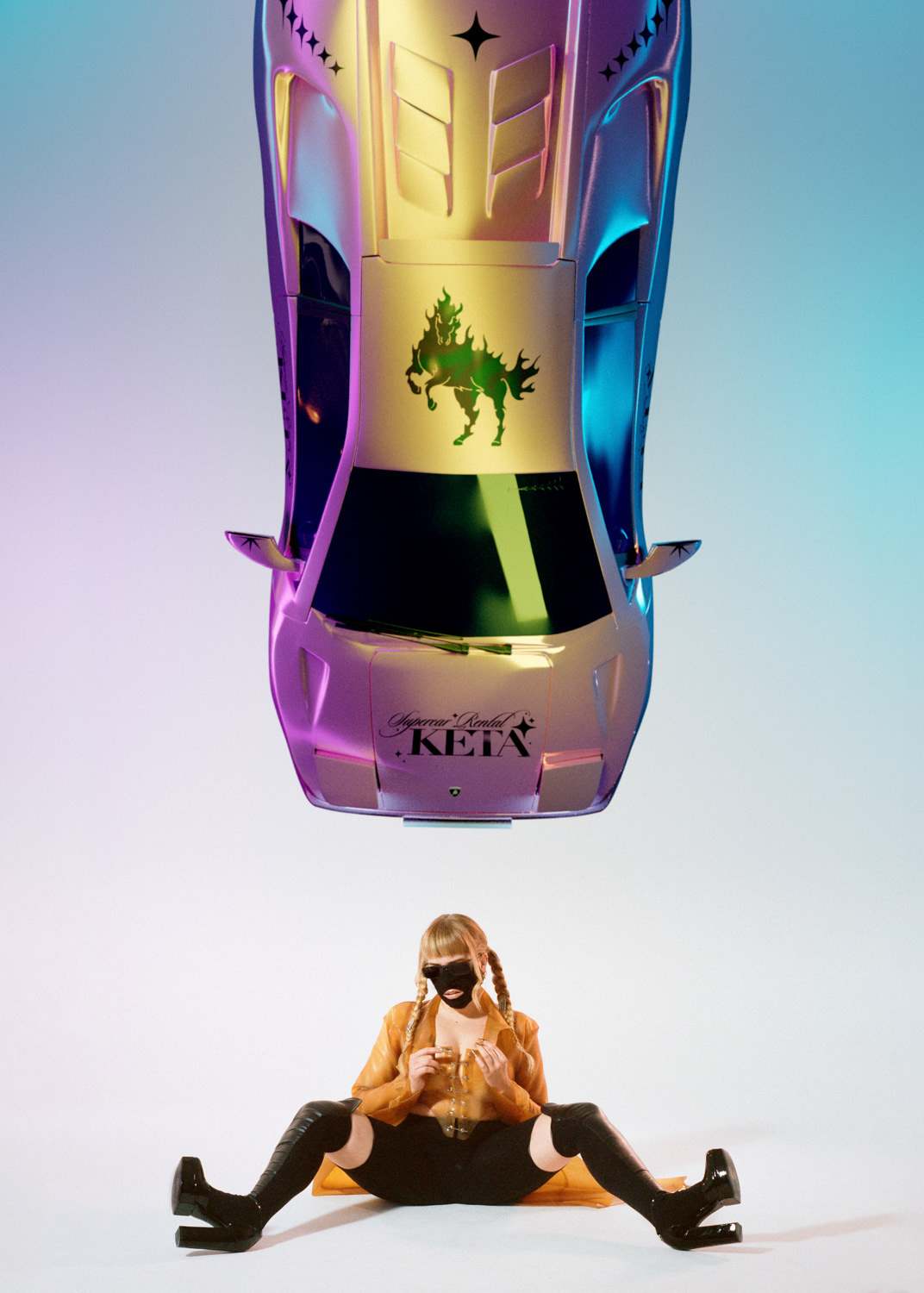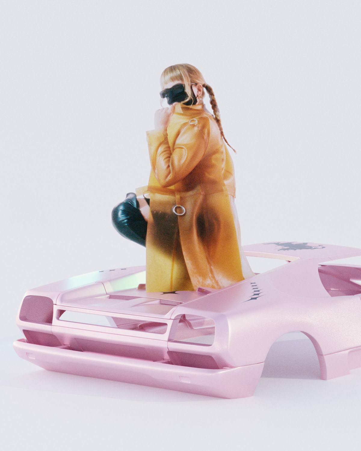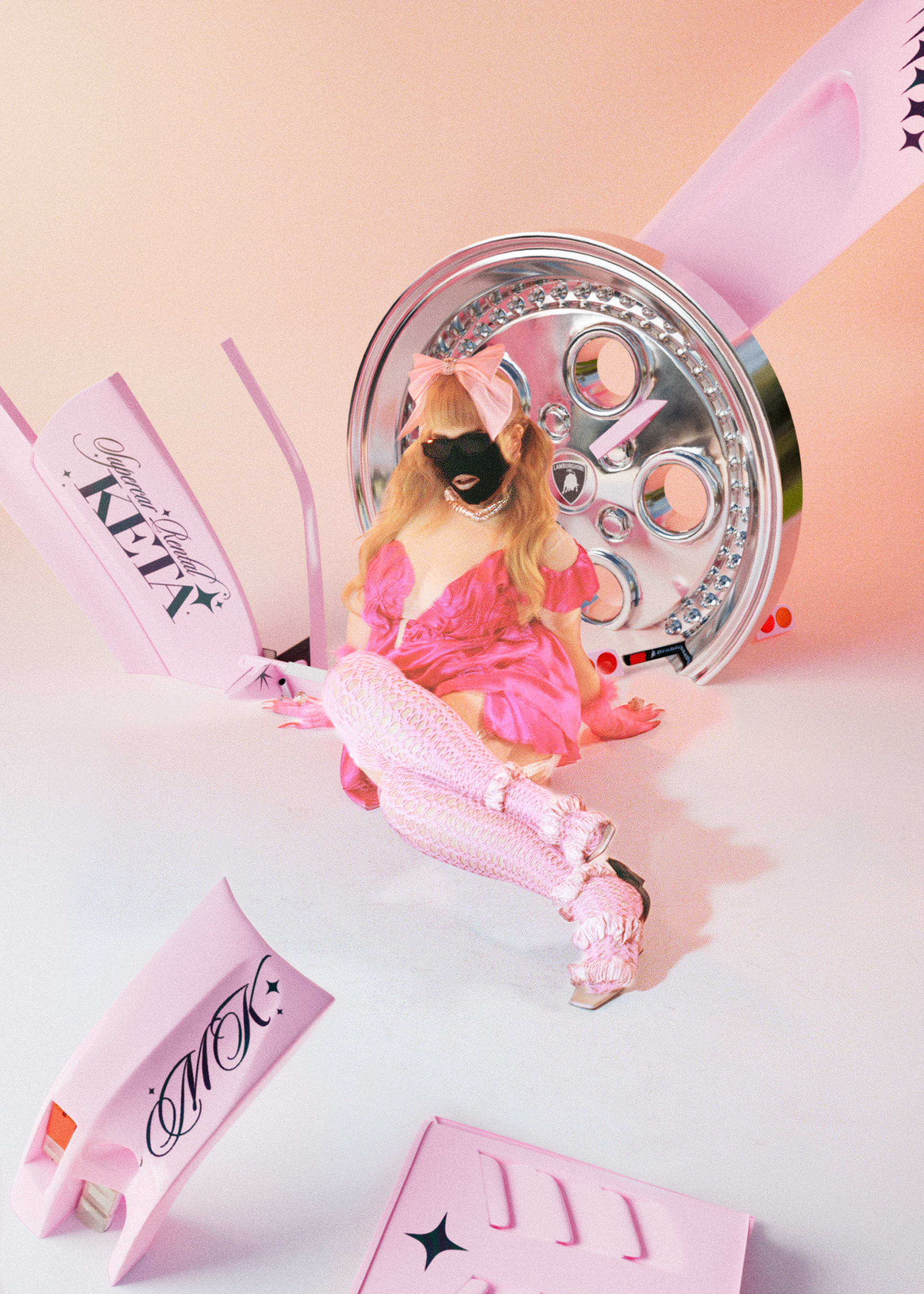 We playfully blended these three universes, using Hélène's soft and dreamy pictures to unlock new visual boundaries with the help of CGI. We envisioned an imaginary rental car owned by Myss Keta and created the dream car for it: a pink Lamborghini Diablo.